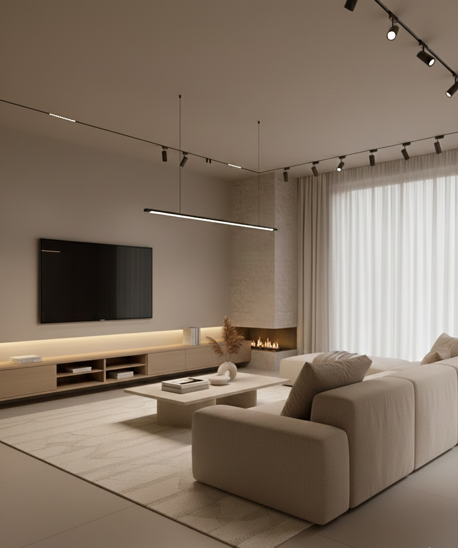 Bố cục ánh sáng gồm đèn tab, đèn hắt và đèn trần hiện đại, tạo chiều sâu cho không gian.