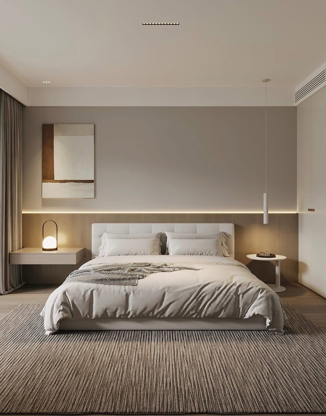 - Tường đầu giường ốp gỗ kết hợp sơn trung tính cùng đèn LED hắt nhẹ tạo chiều sâu