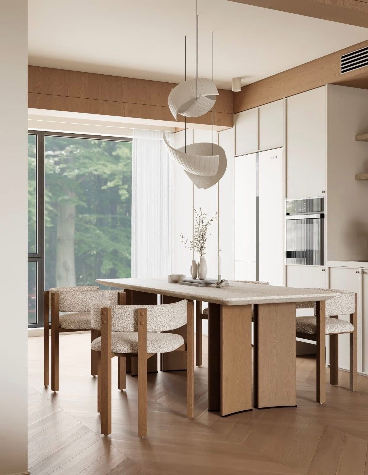 Không gian trong bộ thiết kế này mang đậm tinh thần Modern Minimalism phong cách hiện đại tối giản kết hợp bảng màu trung tính ấm áp như be kem nâu gỗ xám nhạt tạo nên cảm giác nhẹ nhàng thư giãn nhưng vẫn sang trọng và có chiều sâu.