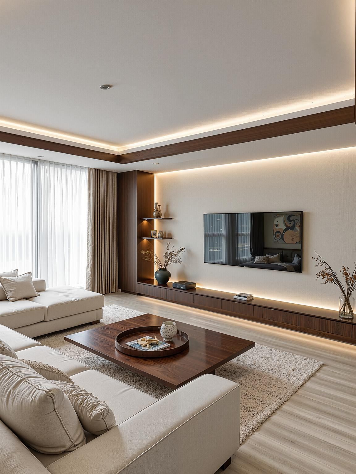Phòng khách Minimal sử dụng gam màu trung tính như trắng – kem – nâu nhạt, tạo hiệu ứng thị giác rộng hơn và mang lại cảm giác thư thái.