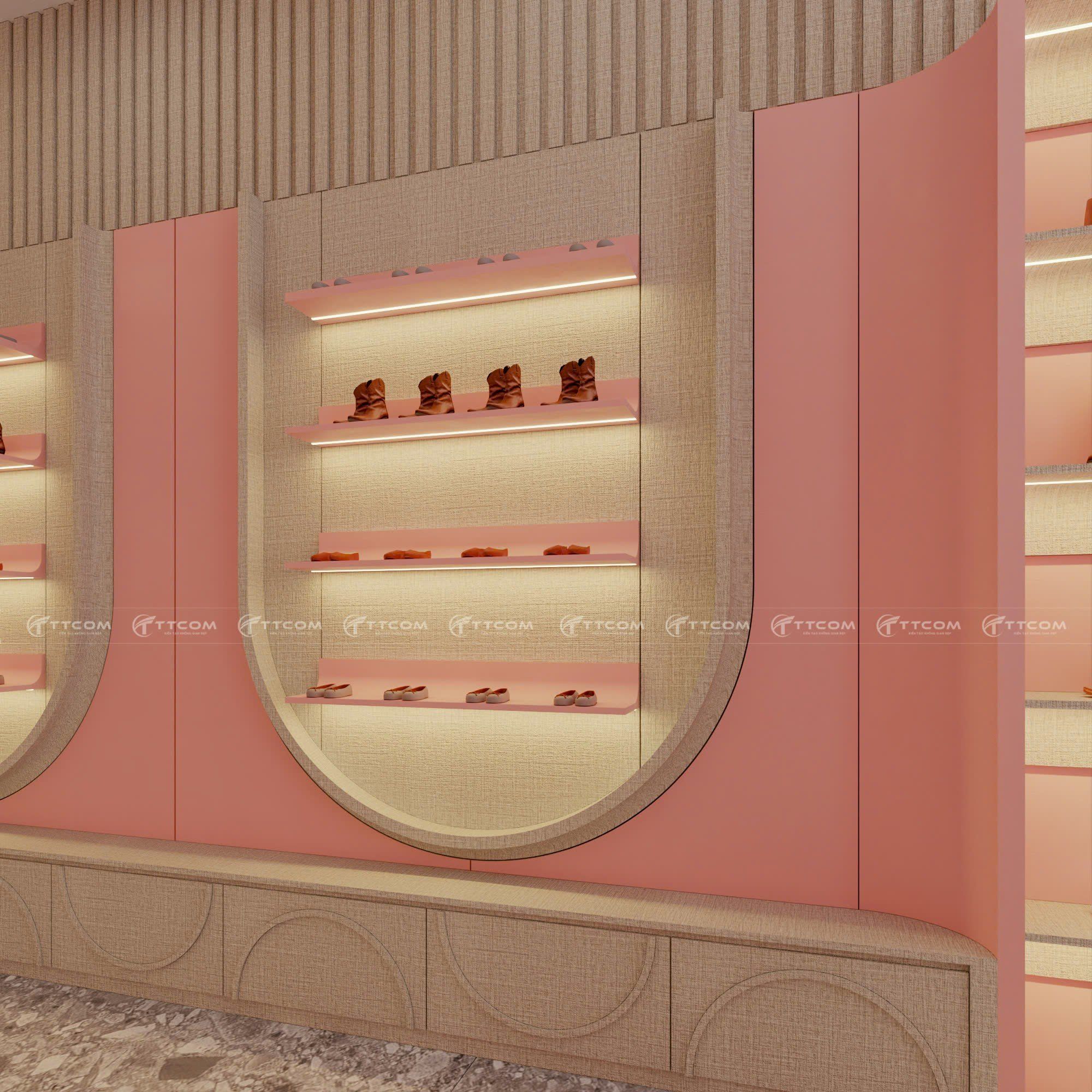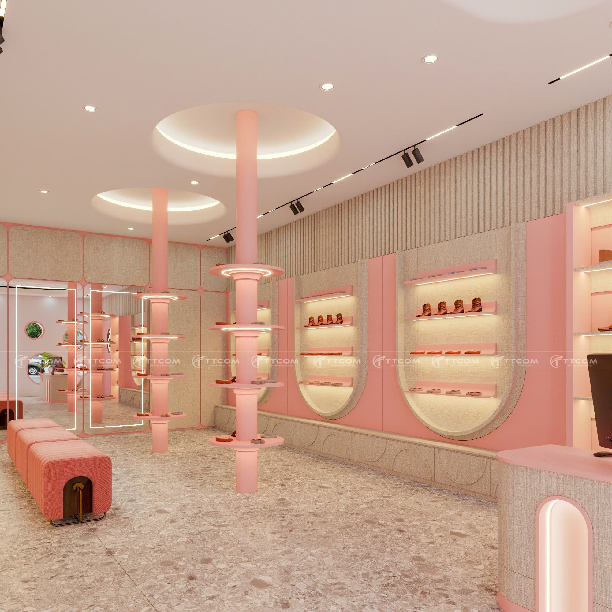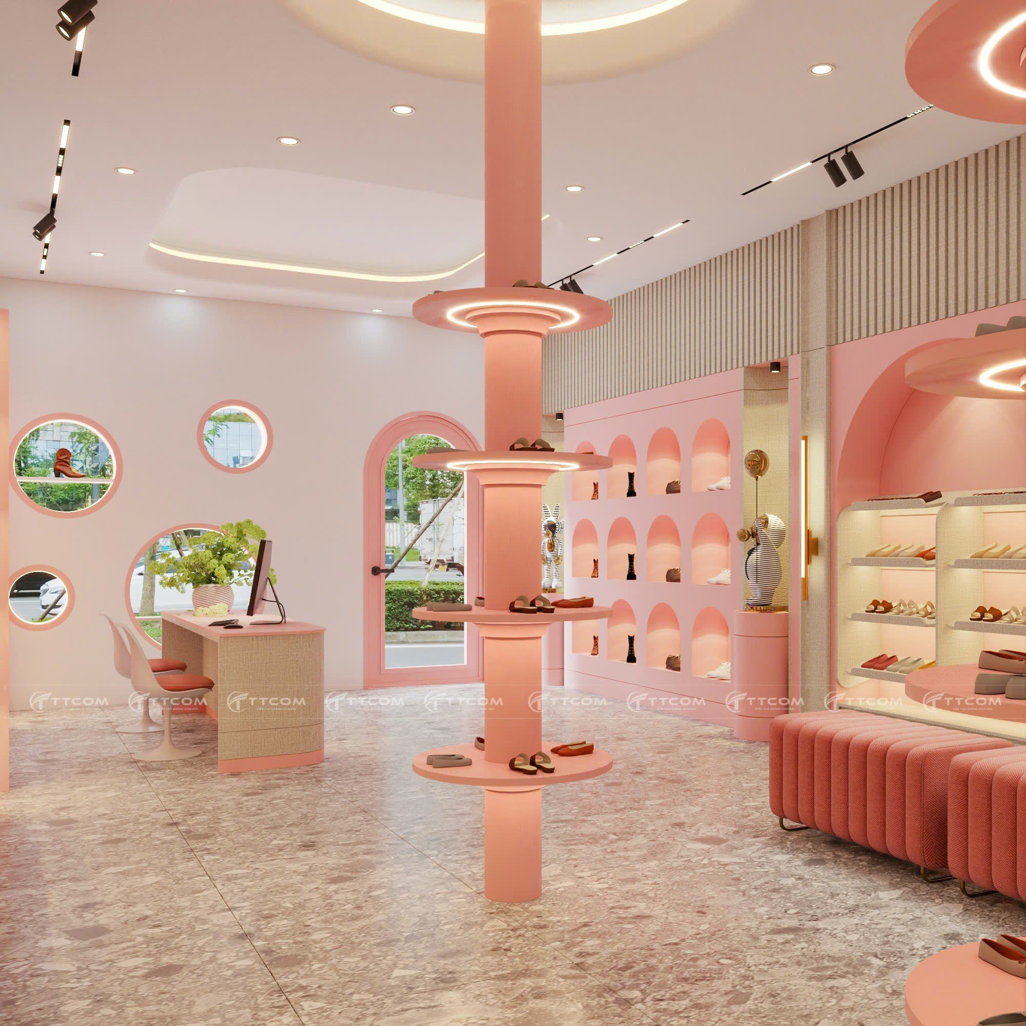 Khám phá mẫu thiết kế shop giày trẻ em với phong cách hiện đại, tông hồng pastel ngọt ngào, không gian mua sắm ấn tượng, thu hút khách hàng.