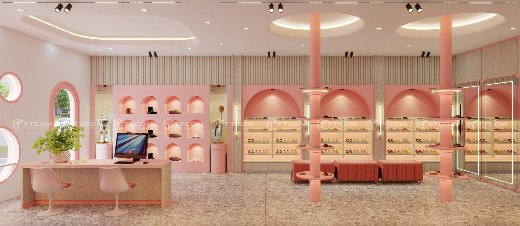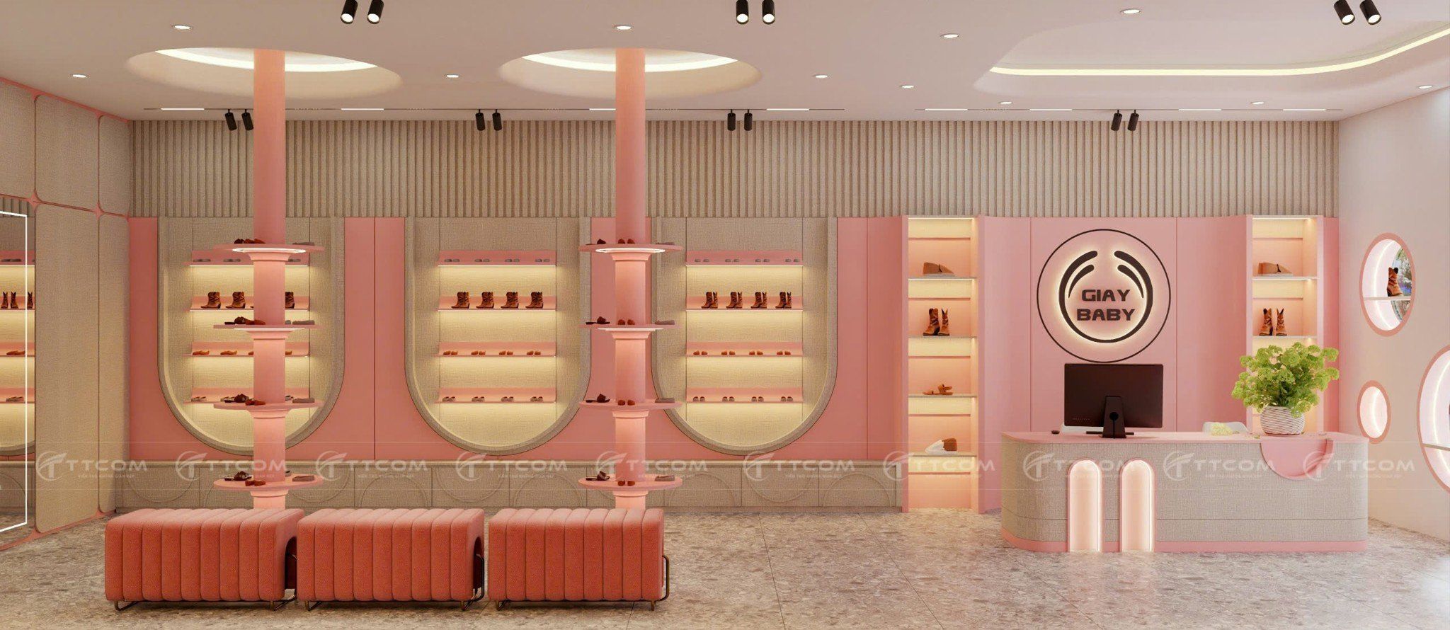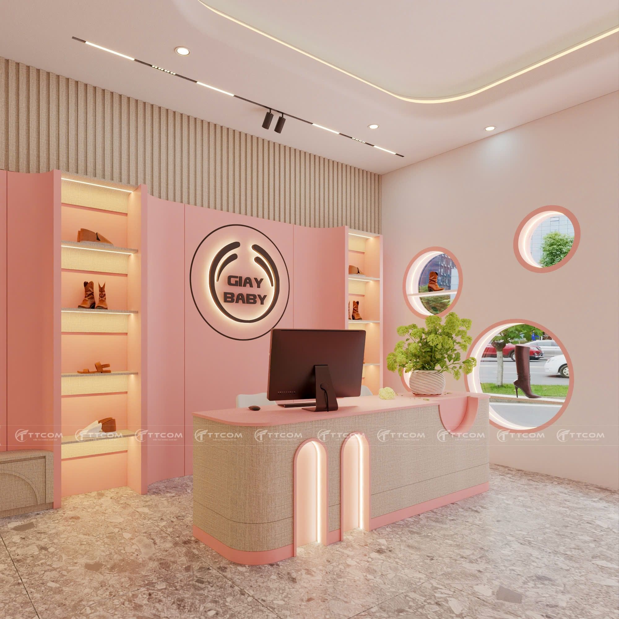 Khám phá mẫu thiết kế shop giày trẻ em với phong cách hiện đại, tông hồng pastel ngọt ngào, không gian mua sắm ấn tượng, thu hút khách hàng.