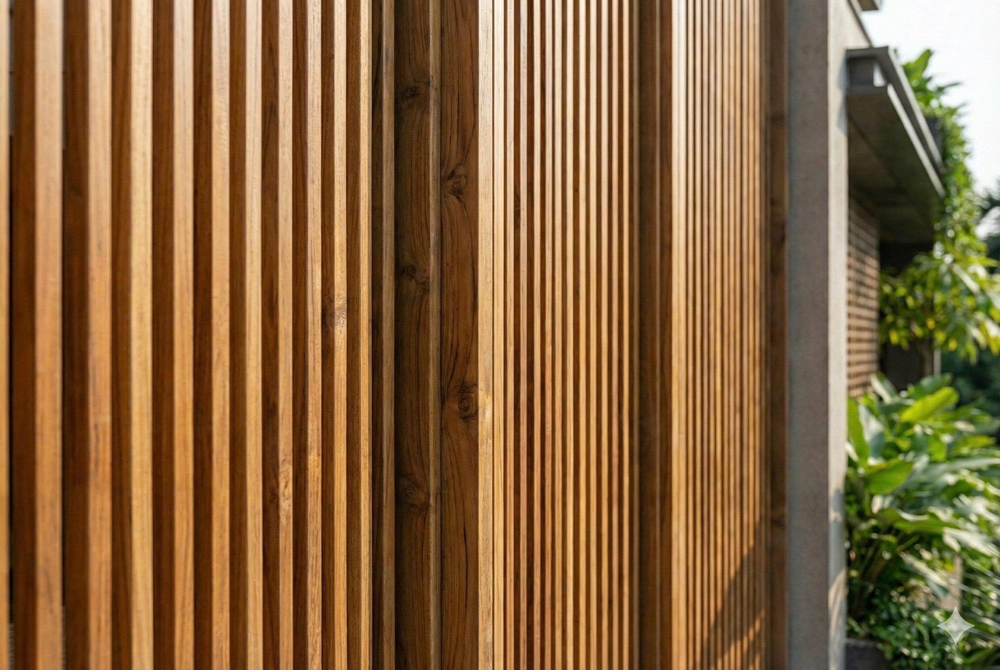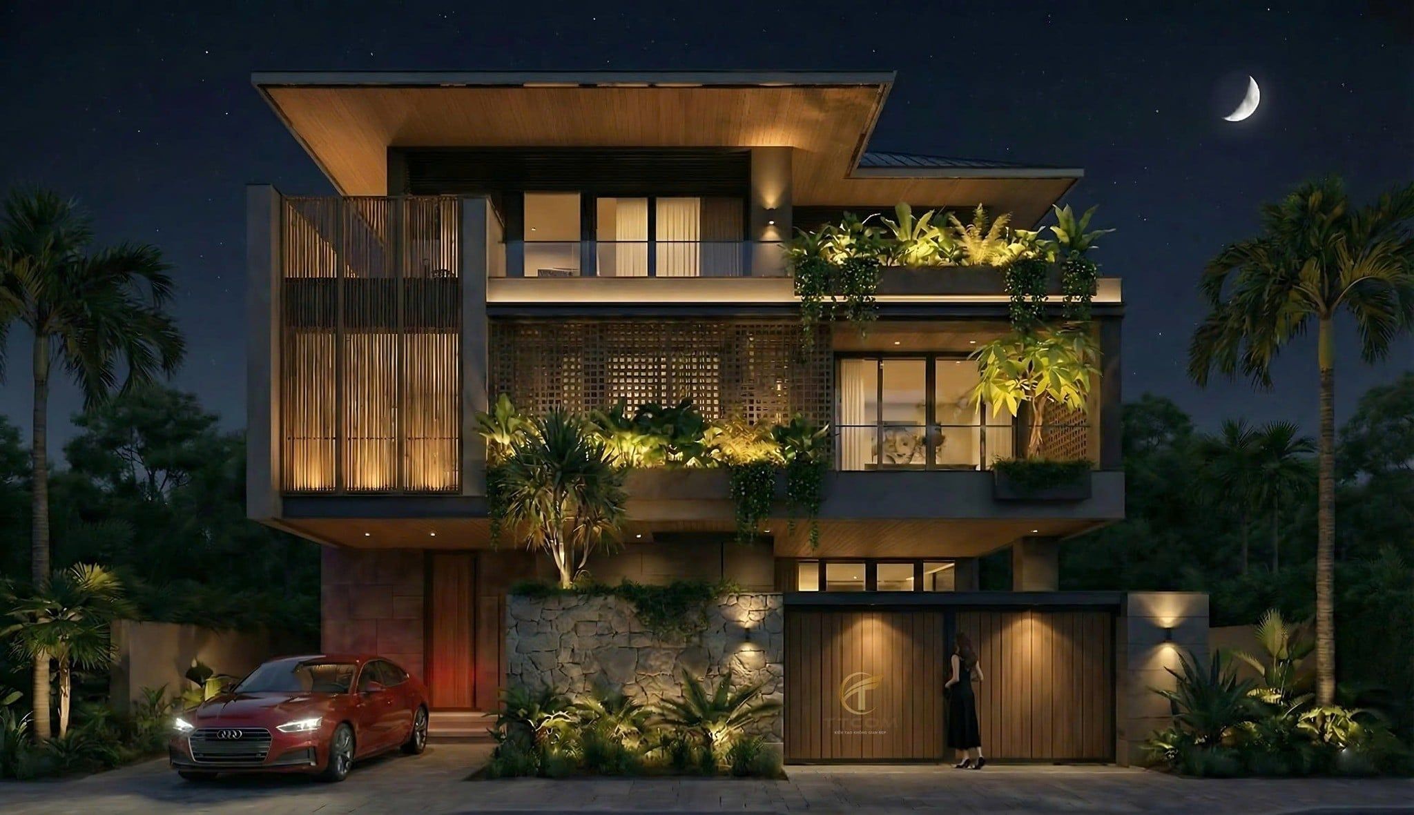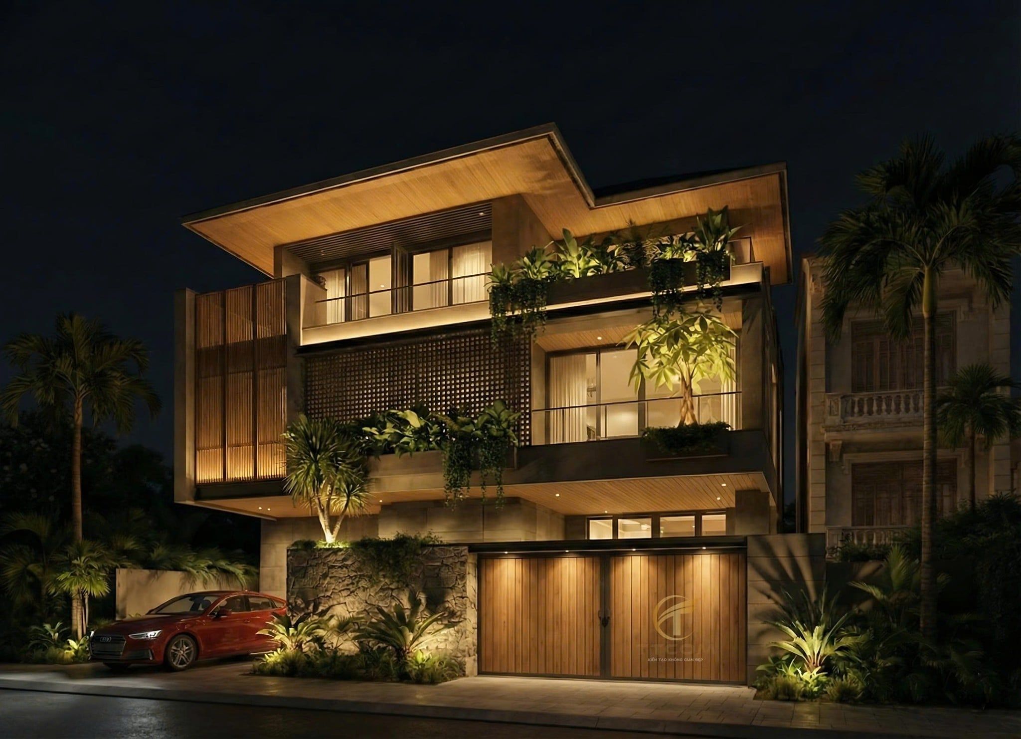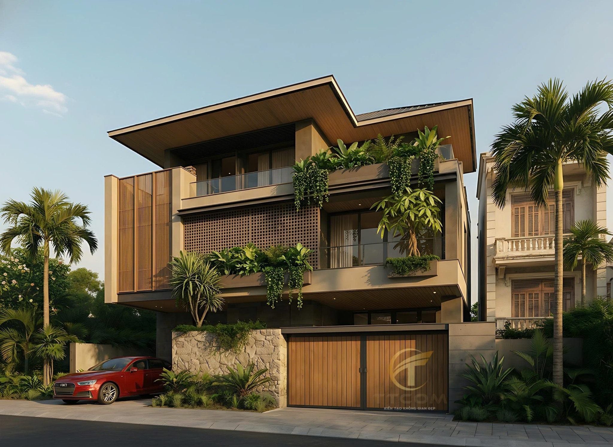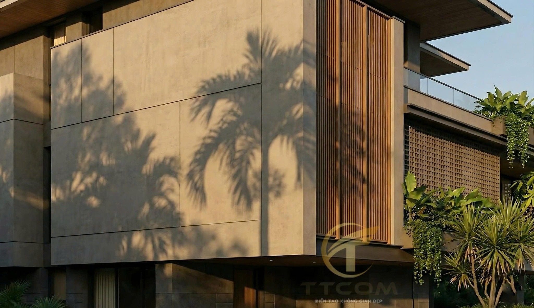 Mặt tiền sử dụng vật liệu hiện đại kết hợp lam gỗ, tạo chiều sâu kiến trúc và che nắng hiệu quả