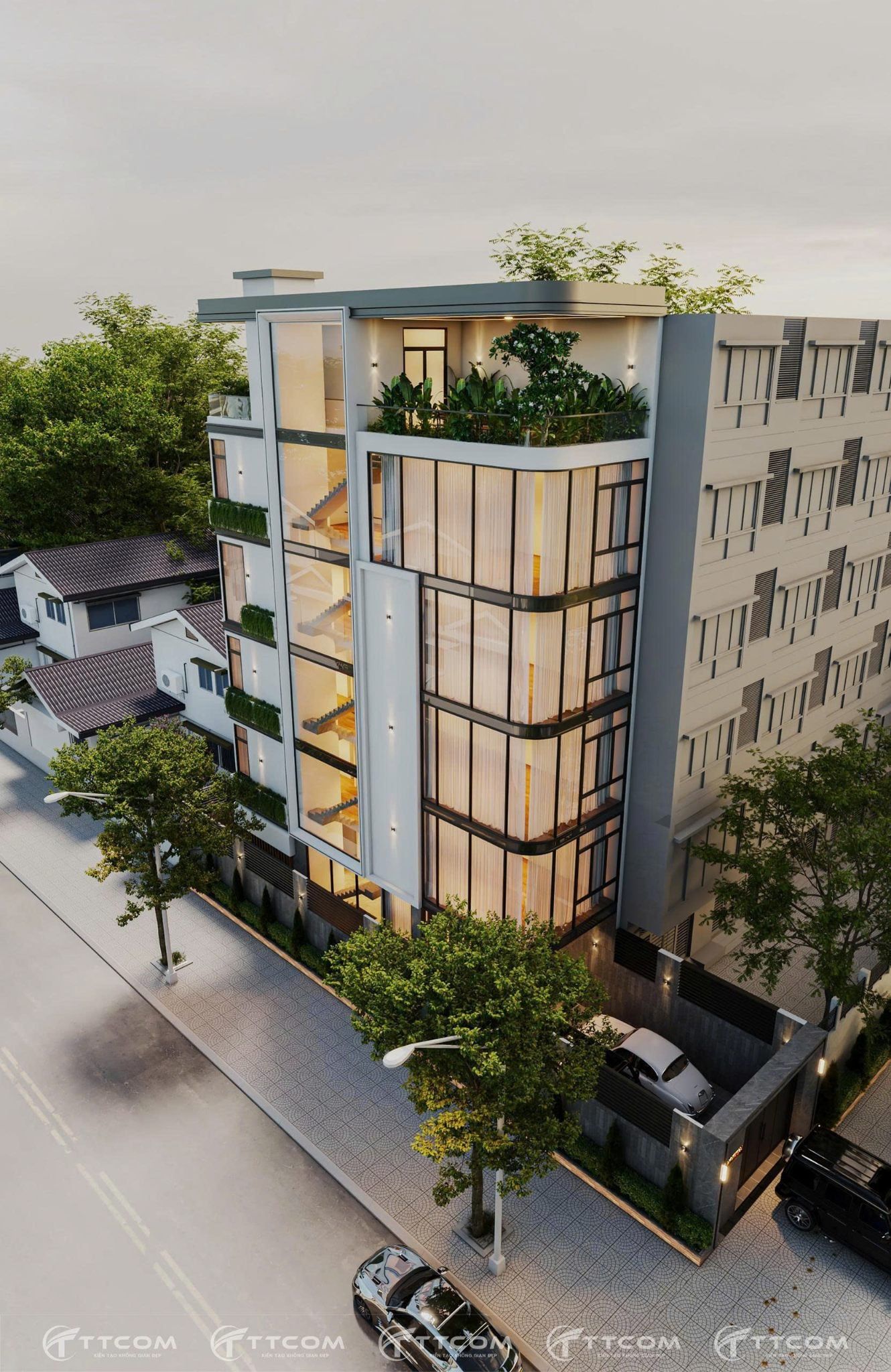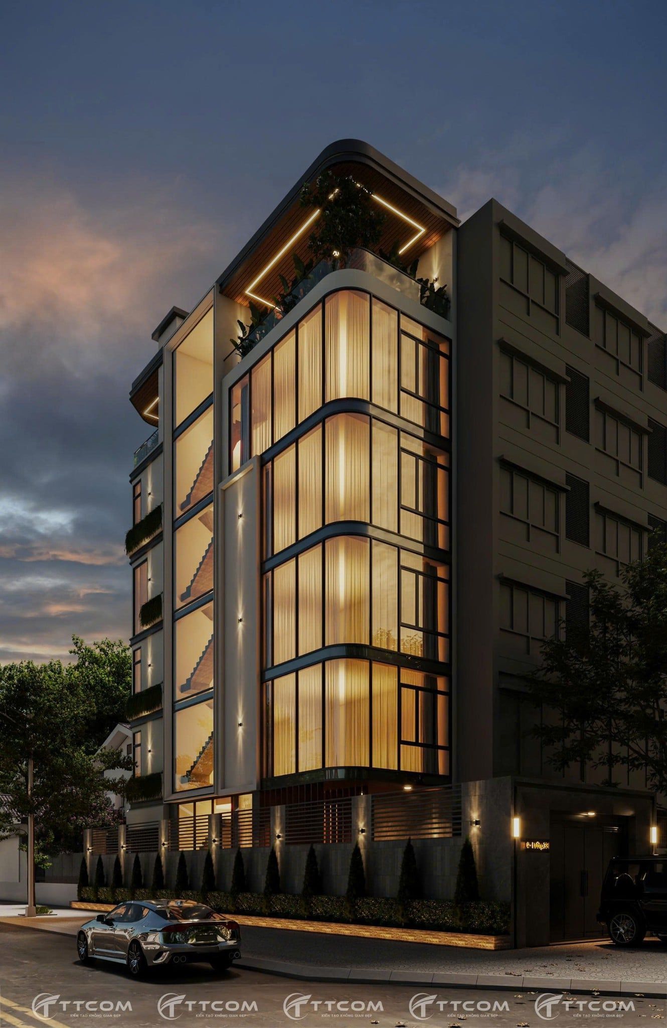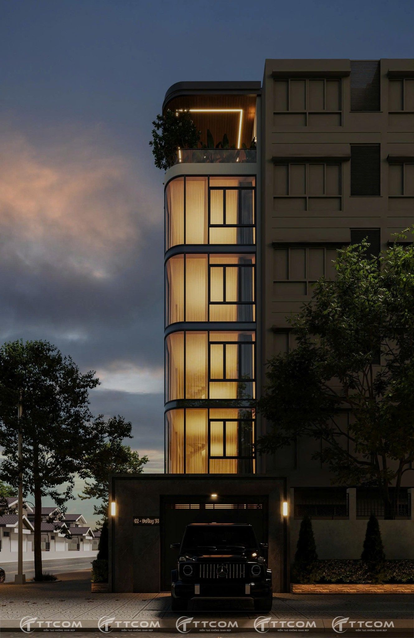 Thay vì sử dụng các mảng khối vuông cứng truyền thống, kiến trúc sư của TTCOM Group lựa chọn giải pháp bo cong mặt tiền, giúp công trình trở nên mềm mại, hiện đại và có tính nhận diện cao trong khu dân cư hiện hữu. Đây cũng là xu hướng kiến trúc được ưa chuộng trong các dự án nhà phố cao tầng tại TP. Hồ Chí Minh.