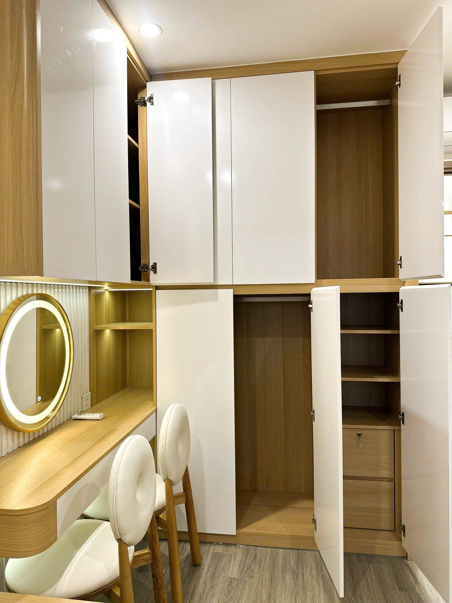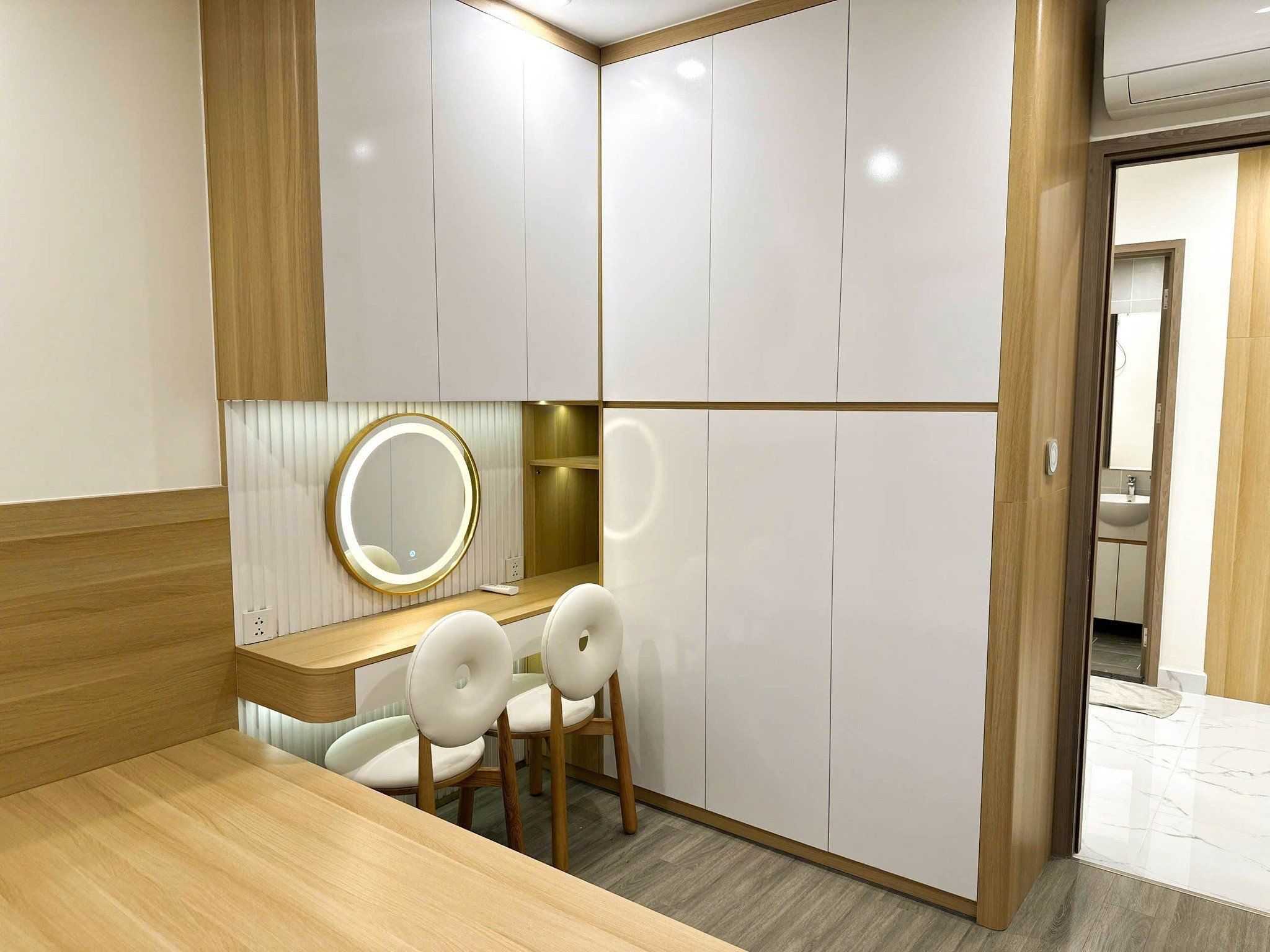 Hệ tủ quần áo âm tường cao đụng trần, bàn trang điểm nhỏ gọn kèm gương tròn LED là điểm nhấn tinh tế trong căn phòng.
