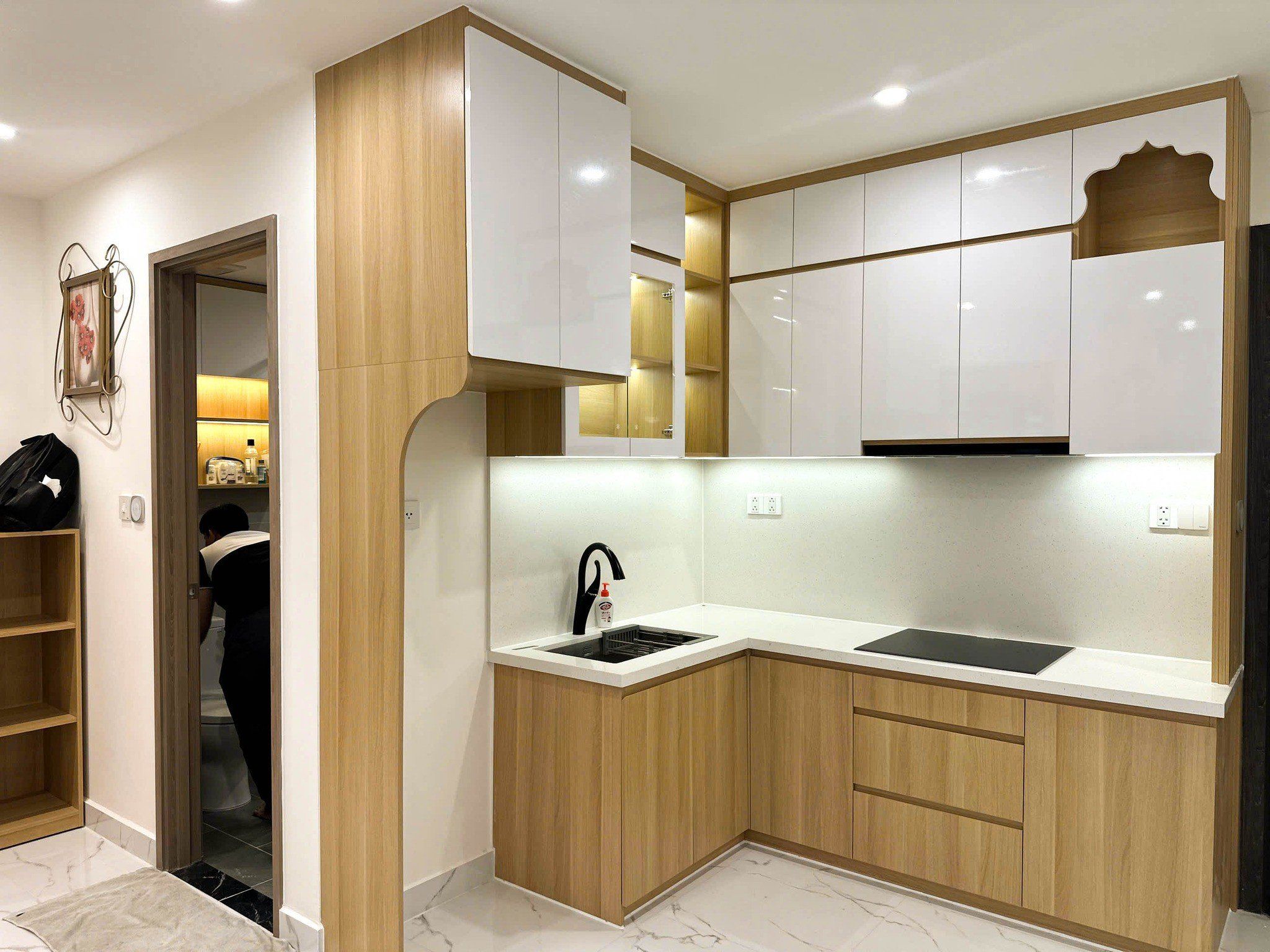 Phòng bếp được bố trí dạng chữ L, vừa tiết kiệm diện tích vừa thuận tiện cho việc di chuyển và nấu nướng.