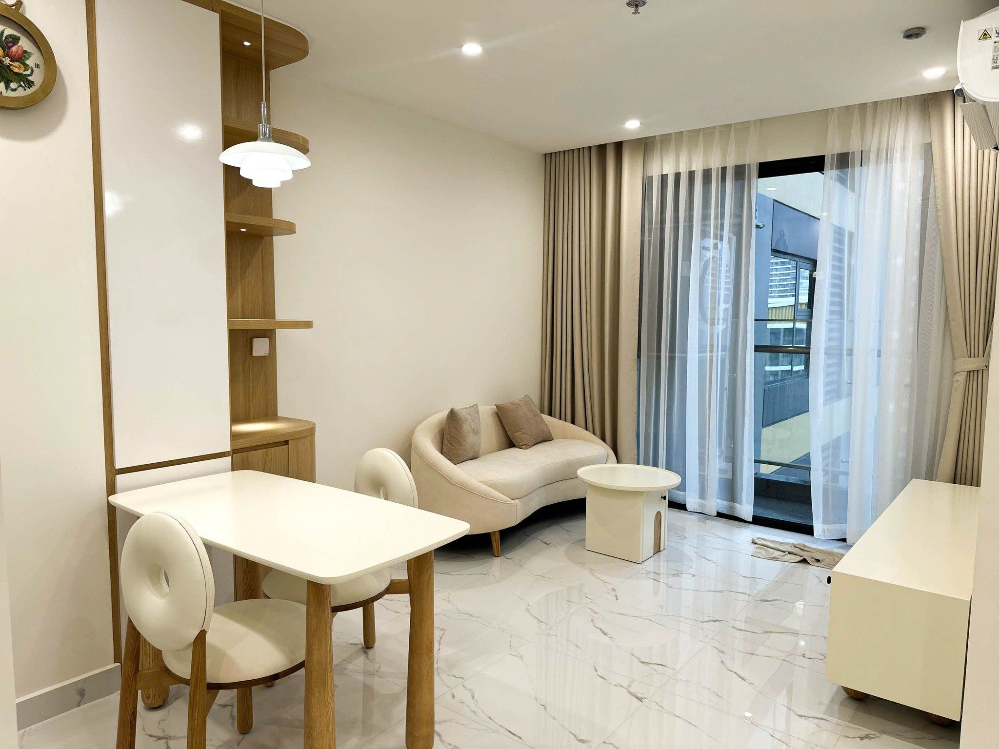 Điểm xuyết thêm bàn trà tròn nhỏ và ghế gỗ tự nhiên, căn hộ mang lại cảm giác “nghỉ dưỡng tại gia” đúng nghĩa.