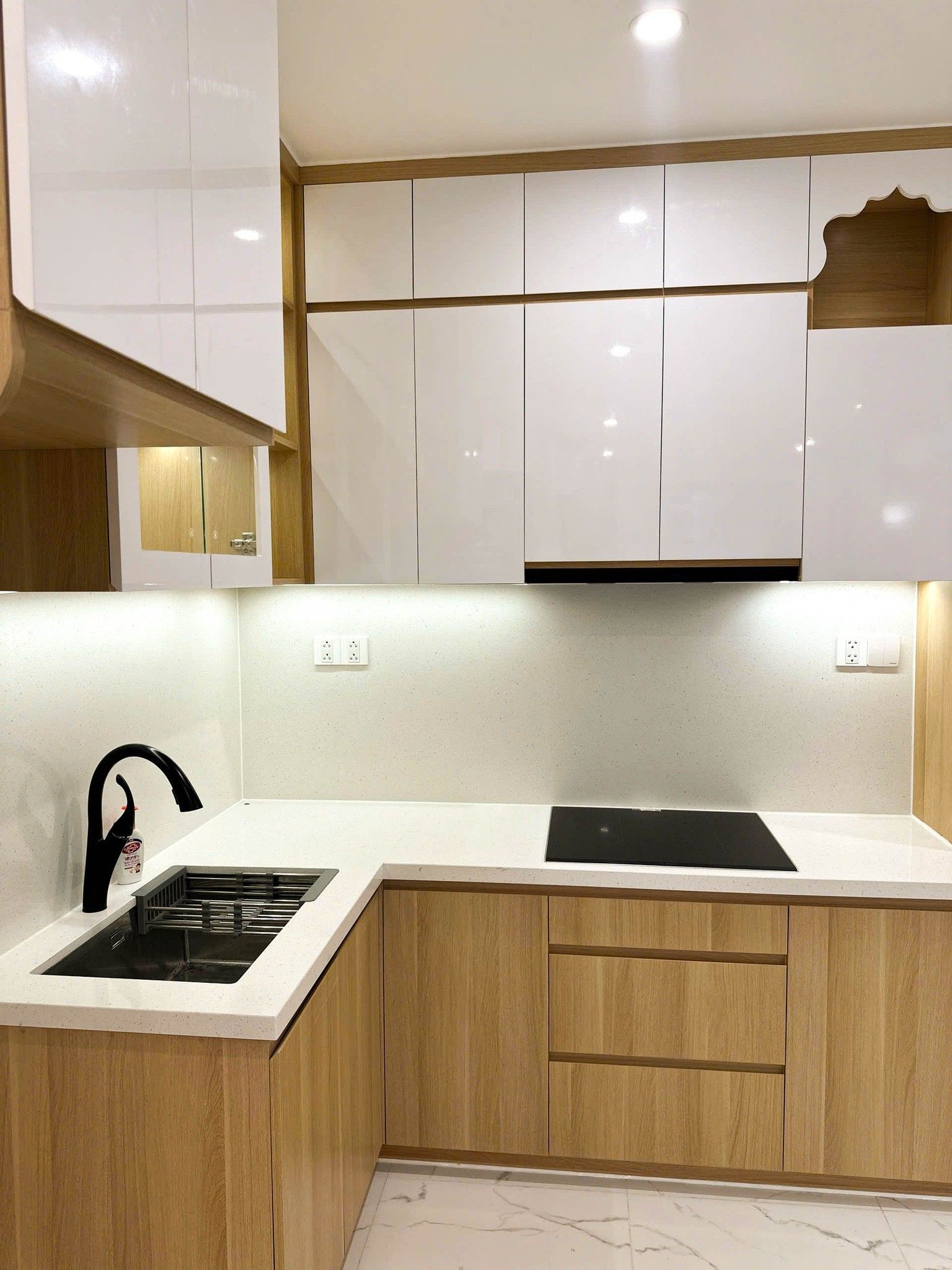 Tủ bếp trên dưới được thi công kịch trần bằng vật liệu MDF chống ẩm phủ Acrylic bóng gương, kết hợp viền gỗ tự nhiên mang lại vẻ đẹp thanh lịch.