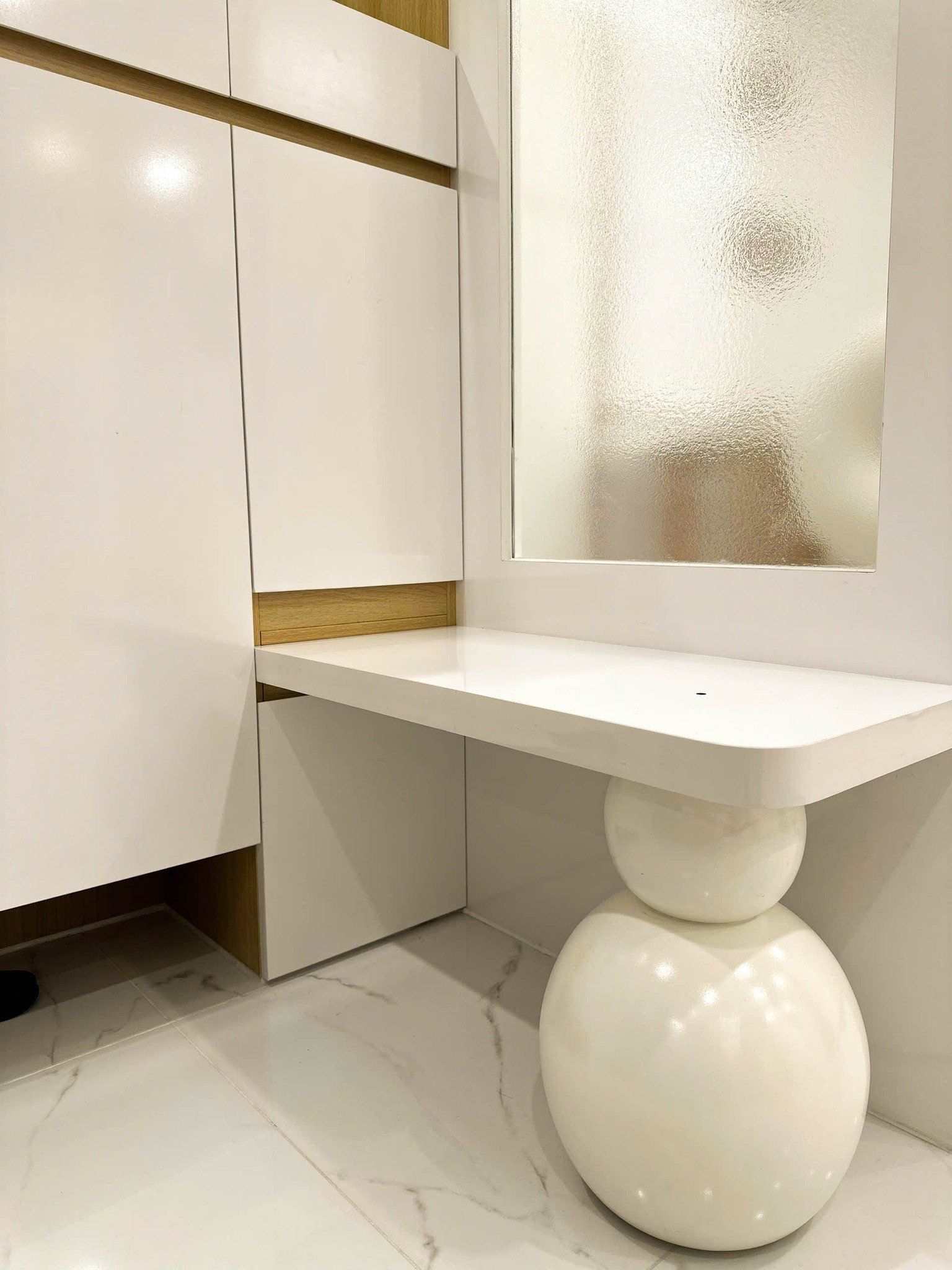 Đường bo cong mềm mại ở mép bàn và góc tủ tạo cảm giác sang trọng, tránh va chạm.