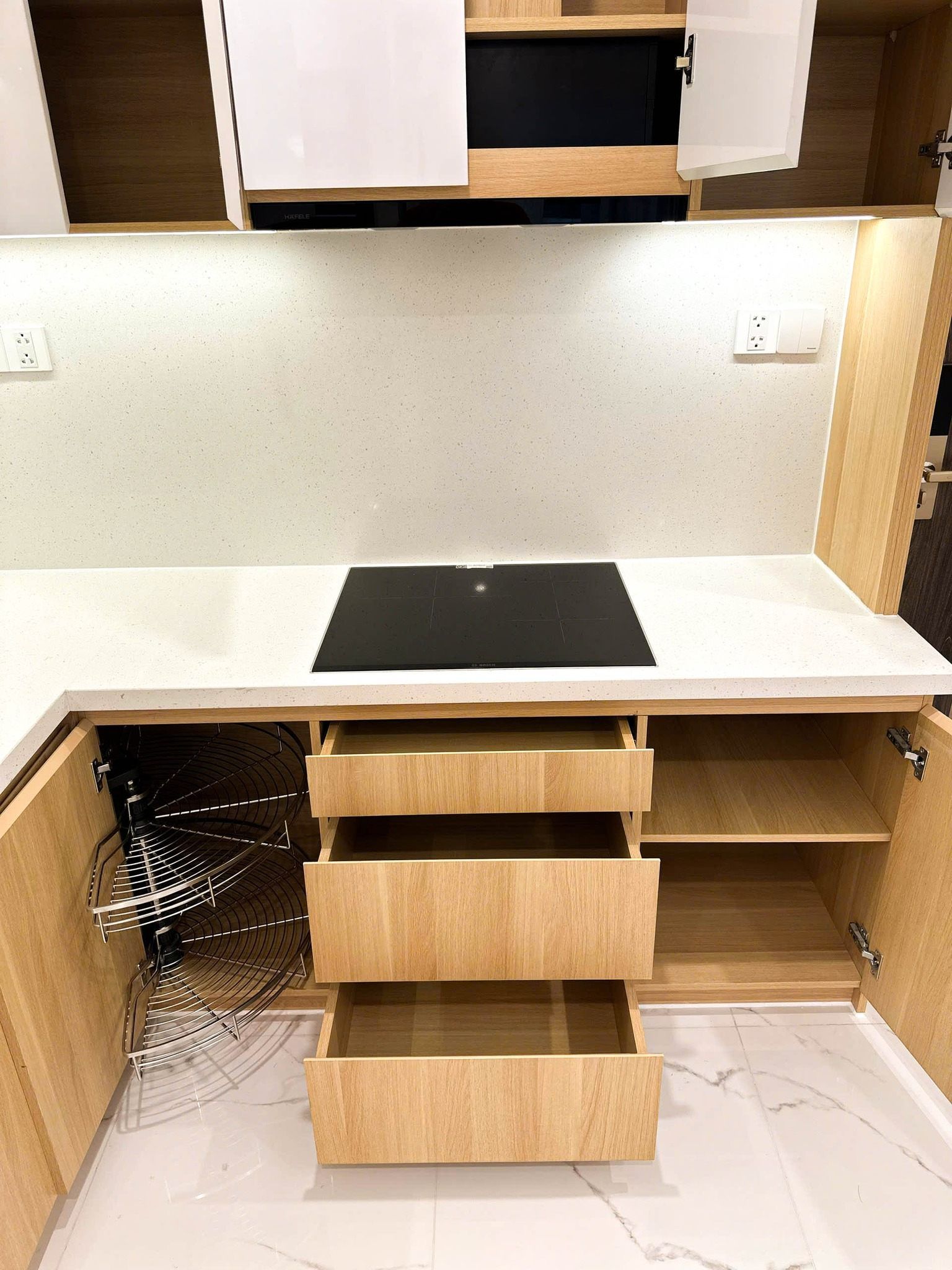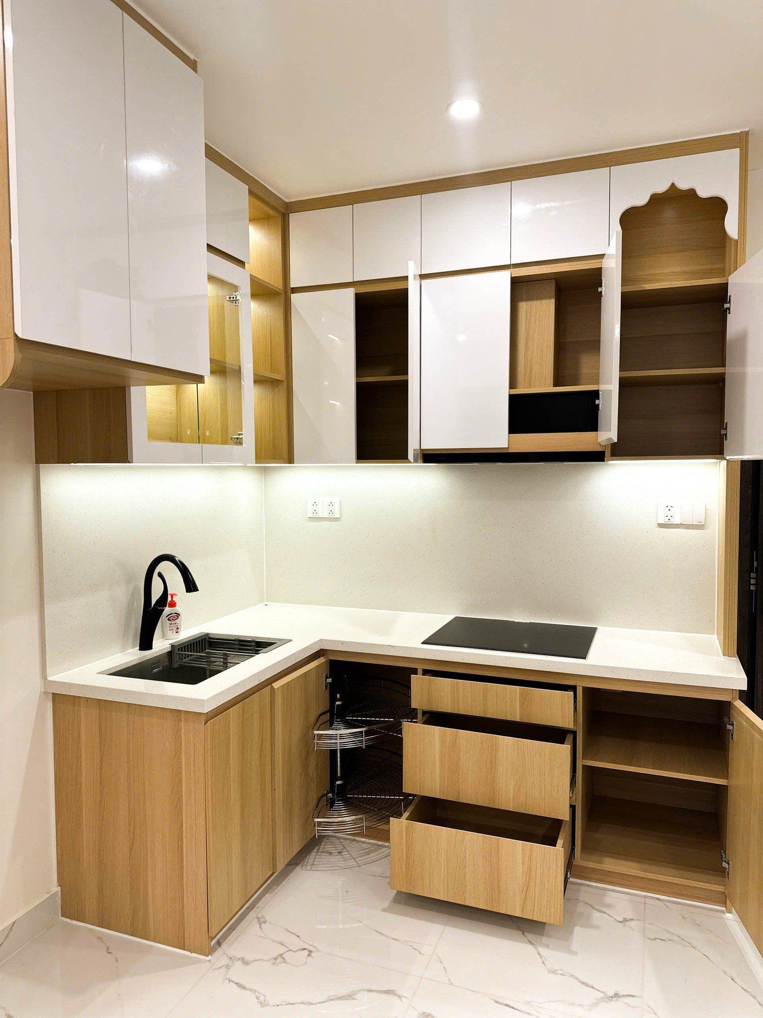 Ngăn kéo giảm chấn, mâm xoay góc tủ giúp thao tác nấu ăn nhanh và thuận tiện