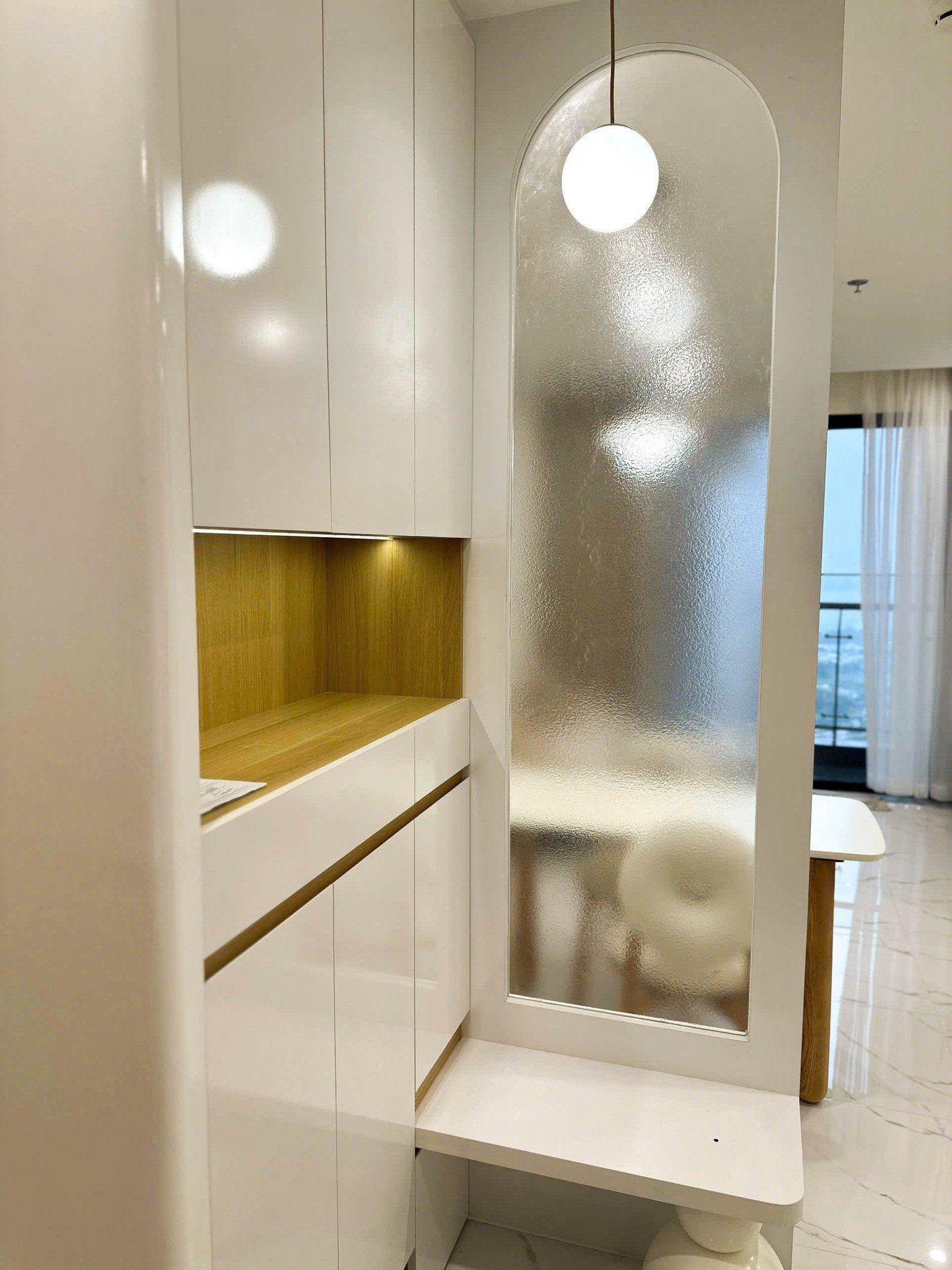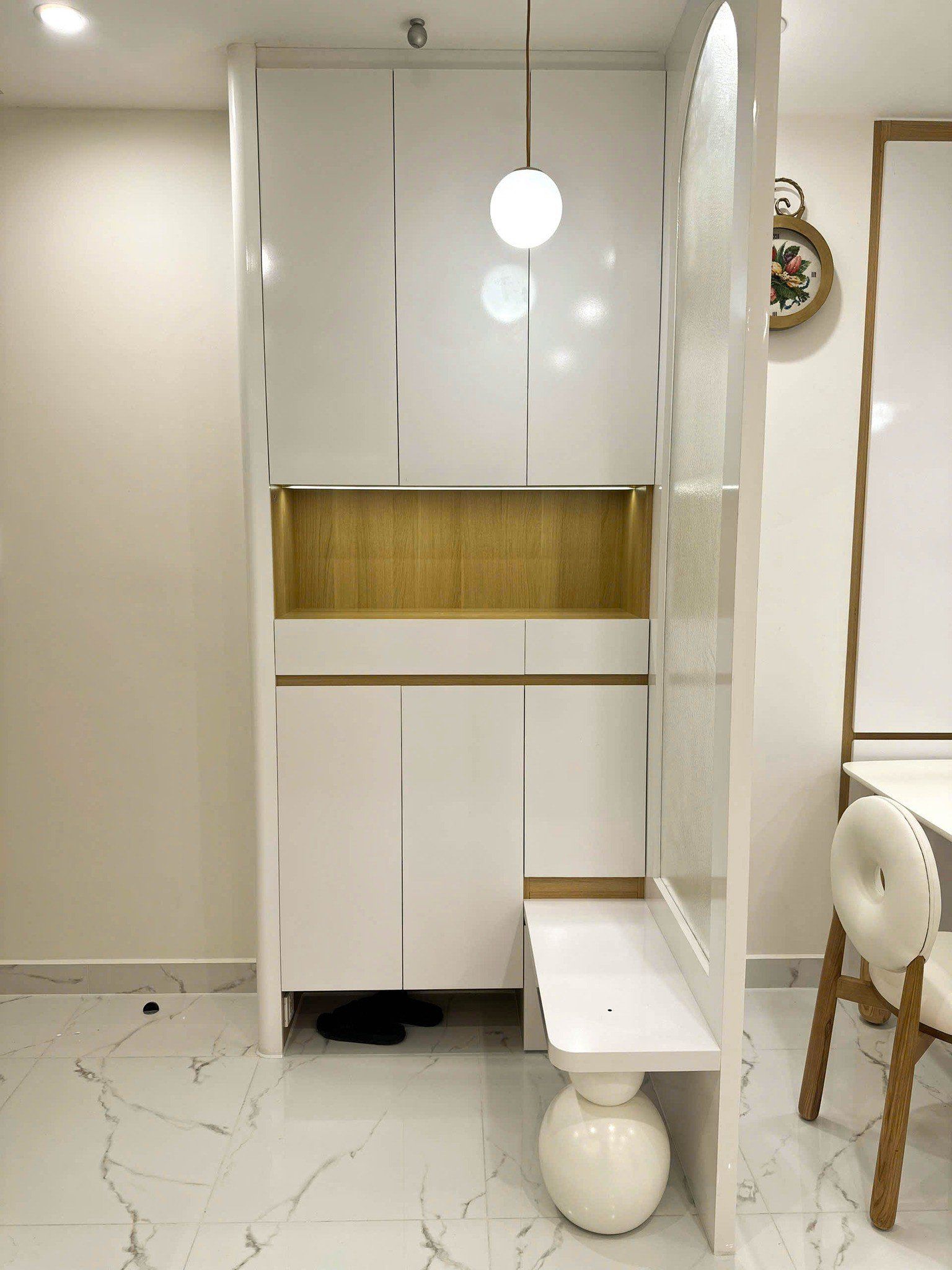 Tại khu vực sảnh vào, tủ kết hợp ghế ngồi được bố trí tinh tế, vừa giúp cất giữ giày dép gọn gàng, vừa tạo điểm dừng chân nhỏ trước khi bước vào không gian chính.