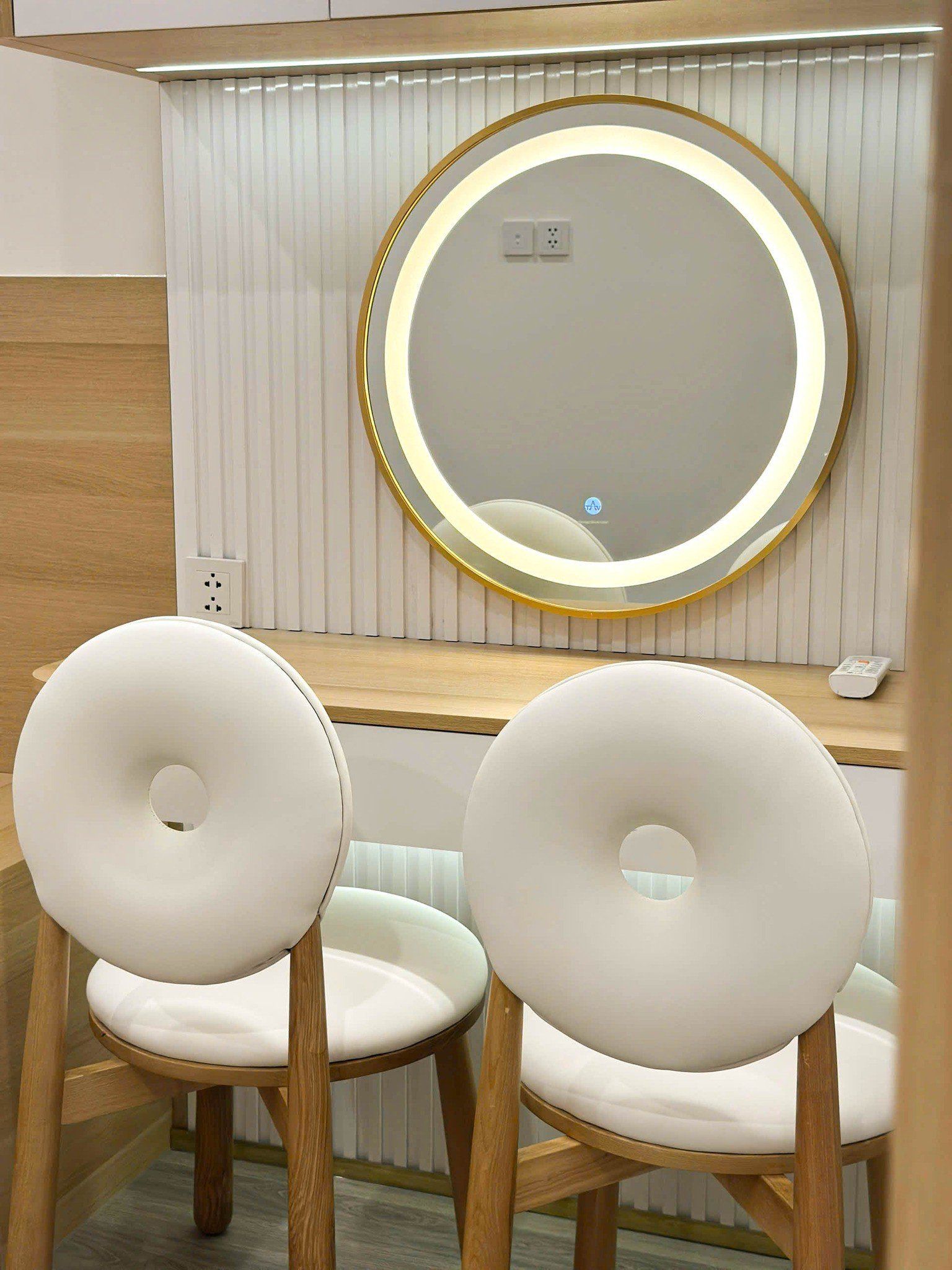 Tổng thể không gian sử dụng gam màu trắng, be và vân gỗ sáng, mang đến cảm giác ấm áp, thanh lịch và sang trọng.