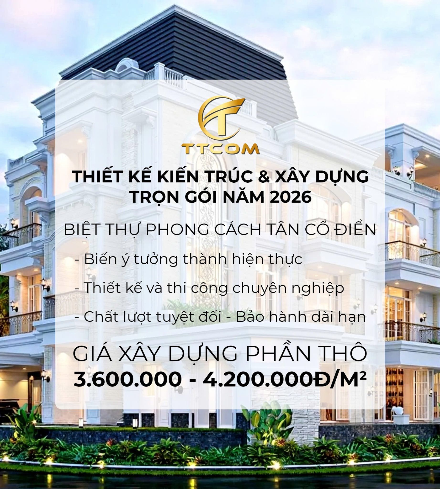 Top 20 mẫu biệt thự tân cổ điển vẫn trường tồn trong năm 2026 là những giải pháp kiến trúc mang tính bền vững, phù hợp với nhiều nhu cầu và quy mô đầu tư khác nhau. Với kinh nghiệm thực tế và tư duy thiết kế cập nhật, TTCom tự tin mang đến cho khách hàng những công trình biệt thự tân cổ điển vừa sang trọng, vừa chuẩn công năng và bền đẹp theo thời gian.